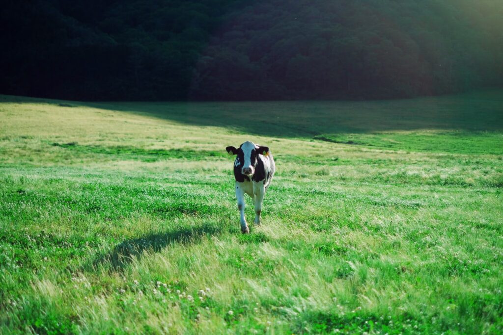 今日も、牛が草を食べてミルクを出し、
